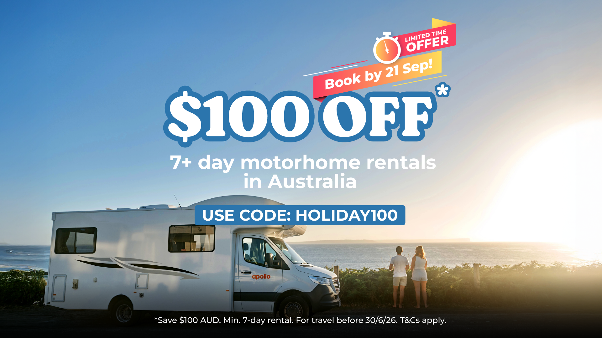 HOLIDAY100 promo code entitles the user to 100AUD off the total booking cost of eligible vehicle rentals made through motorhomerepublic.com or its affiliates.