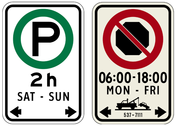 没有停车表的地方一定要先看路边的牌子,有的牌子允许您停车一个或两个小时;有的指明您不能停车;还有的限定只有限定车辆才能停车等等。