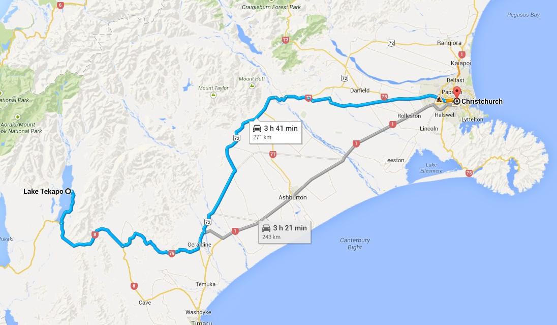 穿越杰拉尔丁- 费尔利公路(Geraldine-Fairlie Highway)和费尔利 - 特卡波道(Fairlie-Tekapo Road)。特卡波湖小镇就在湖边上,这有一个美丽的湖滨公园,叫特卡波湖度假公园。小村庄远离了城市的灯光,使得夜晚的星空更加美丽,明亮的蓝色湖泊旁提供了多样的户外活动和美景,每当天气温暖的时节,湖边还环绕着色彩缤纷的扇豆花。