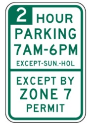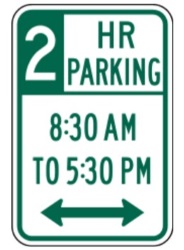 许可泊车:白底绿字,表示车辆可以无限期或有限期停泊。这类标志多数与咪表或停车许可证一并使用。